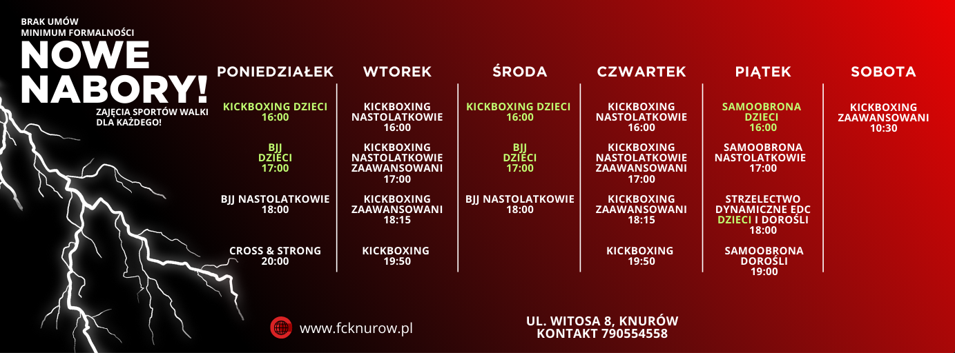 Treningi Miejsce treningów to KNURÓW ul. Witosa 8 Aktualny cennik: Składka miesięczna – 2 treningi w tygodniu 150 zł Składka miesięczna – 1 trening w tygodniu 90 zł 1 trening grupowy 40 zł Karnet Miesięczny Open 210 zł Jednorazowa składka wpisowa 60 zł